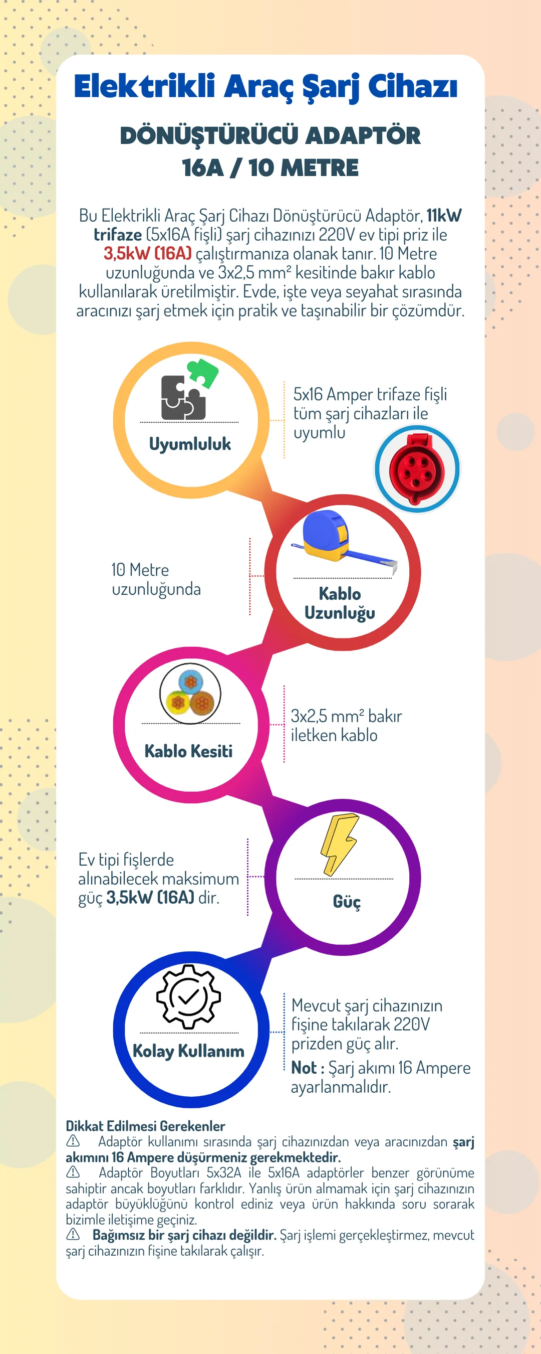 · 5x32A ve 5x16A adaptörler görsel olarak benzer olsa da boyutları farklıdır. Satın almadan önce şarj cihazınızın fiş tipini ve boyutunu kontrol ediniz.