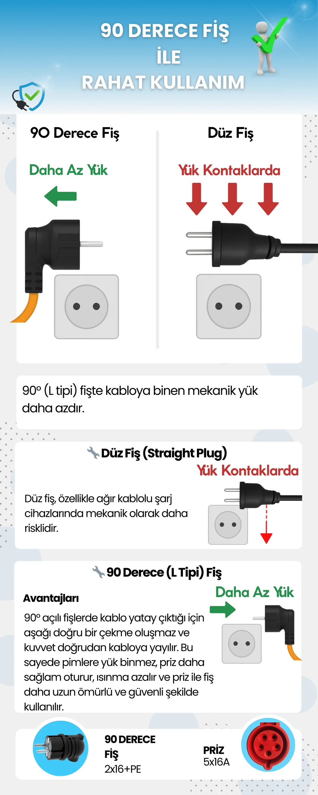 · Uyumluluk: 5x16A trifaze fişli şarj cihazlarını 220V prizde kullanabilme