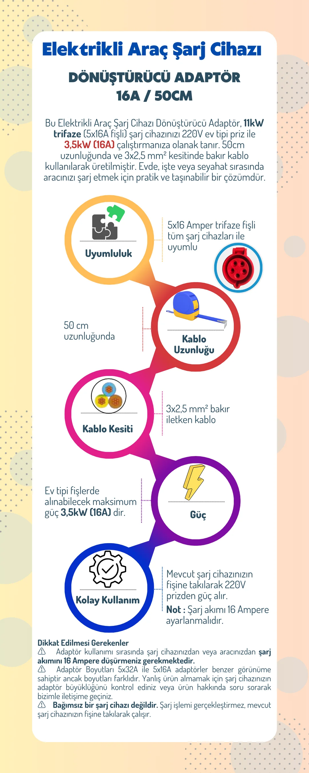 · 5x32A ve 5x16A adaptörler görsel olarak benzer olsa da boyutları farklıdır. Satın almadan önce şarj cihazınızın fiş tipini ve boyutunu kontrol ediniz.
