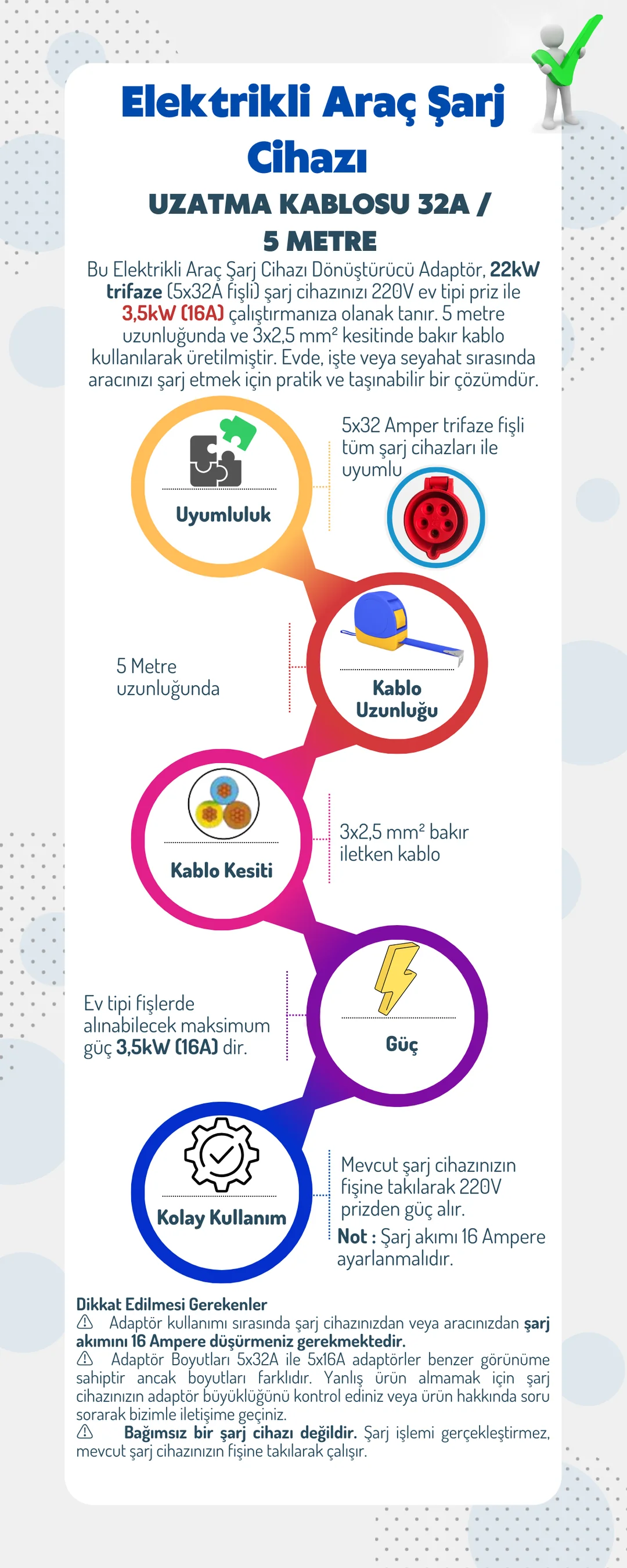 · 5x32A ve 5x16A adaptörler görsel olarak benzer olsa da boyutları farklıdır. Satın almadan önce şarj cihazınızın fiş tipini ve boyutunu kontrol ediniz.