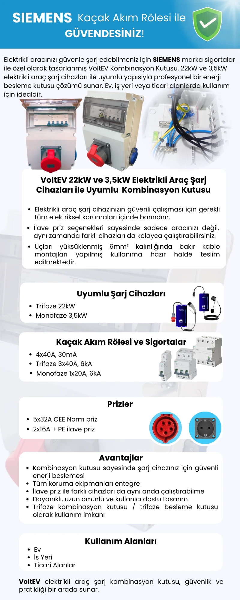VoltEV elektrikli araç şarj kombinasyon kutusu, güvenlik ve pratikliği bir arada sunar.