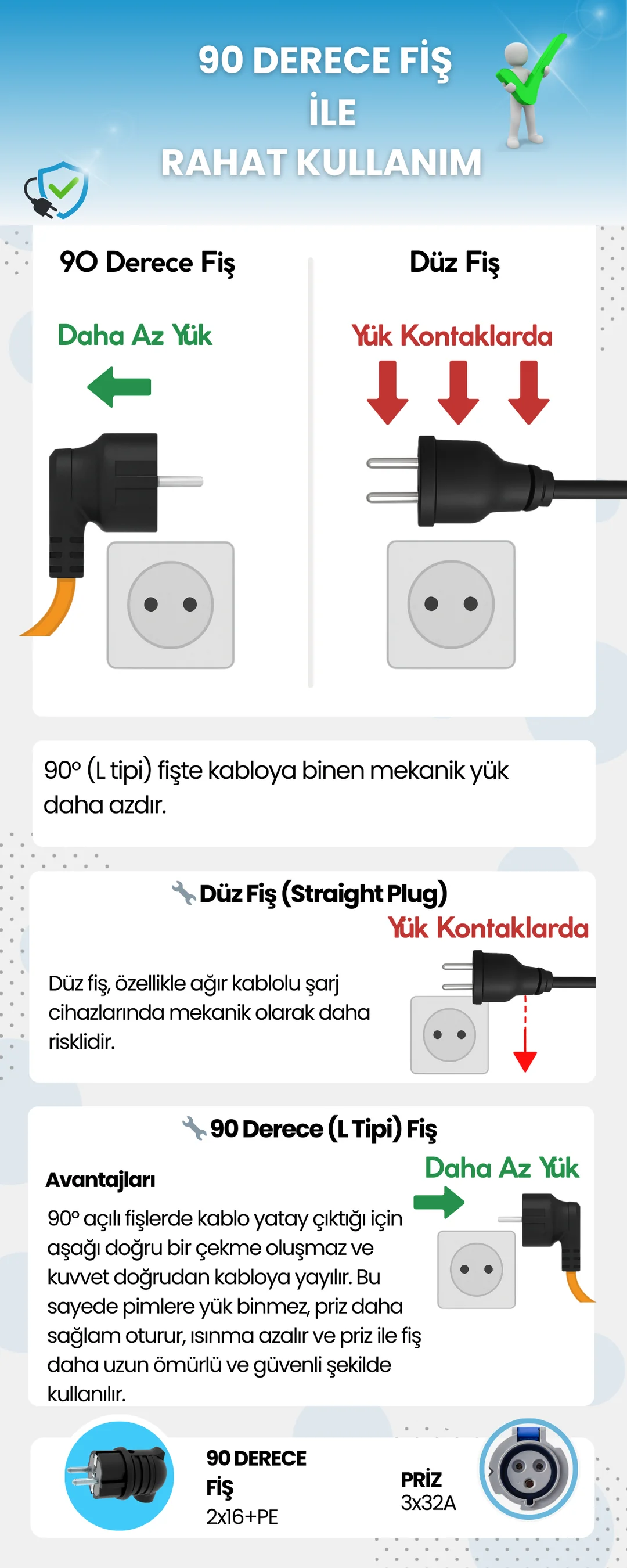 · Uyumluluk: 3x32A monofaze fişli şarj cihazlarını 220V prizde kullanabilme