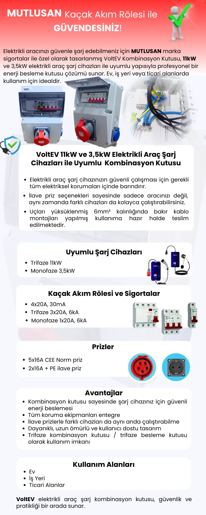 • Elektrikli araç kombinasyon kutusu: Tüm koruma ekipmanları entegre olarak ürün içerisinde bulunmaktadır. (Kaçak Akım+Sigorta)